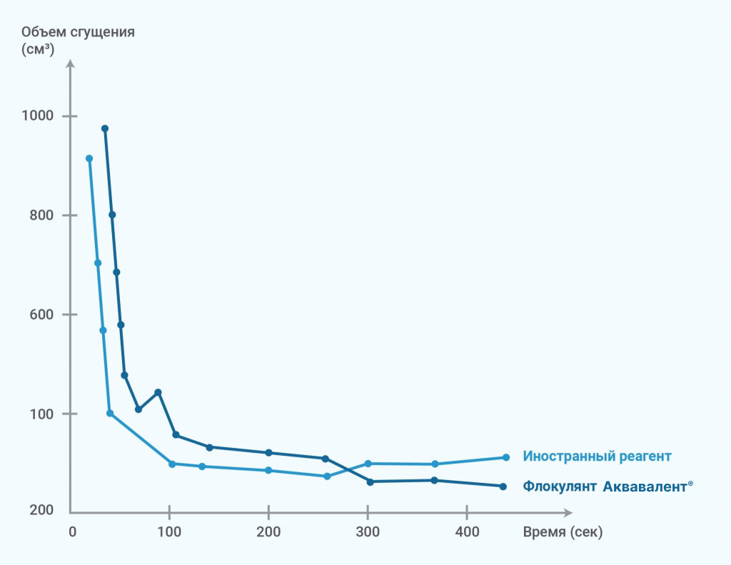 Объем осадка. Лабораторное испытание показало, что флокулянт Аквавалент® продолжает сокращать объем сгущенного осадка, когда иностранный реагент уже остановился.
